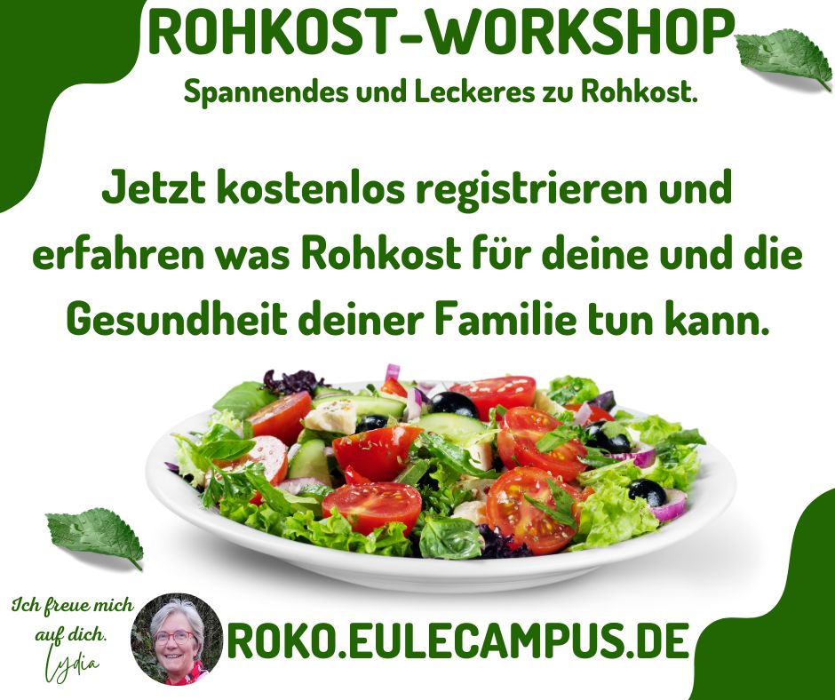 Du willst mehr über die vielfältigen Vorteile von Rohkost erfahren, dann besuche doch einfach den nächsten Rohkost-Workshop hier auf dem EULE Campus. In einer netten Online-Runde erzählt Lydia wissenswertes und interessantes zum Thema Rohkost. In einem regen Austausch werden Fragen beantwortet, Tipps und Ideen weitergegeben. Wer mag kann ein leckeres